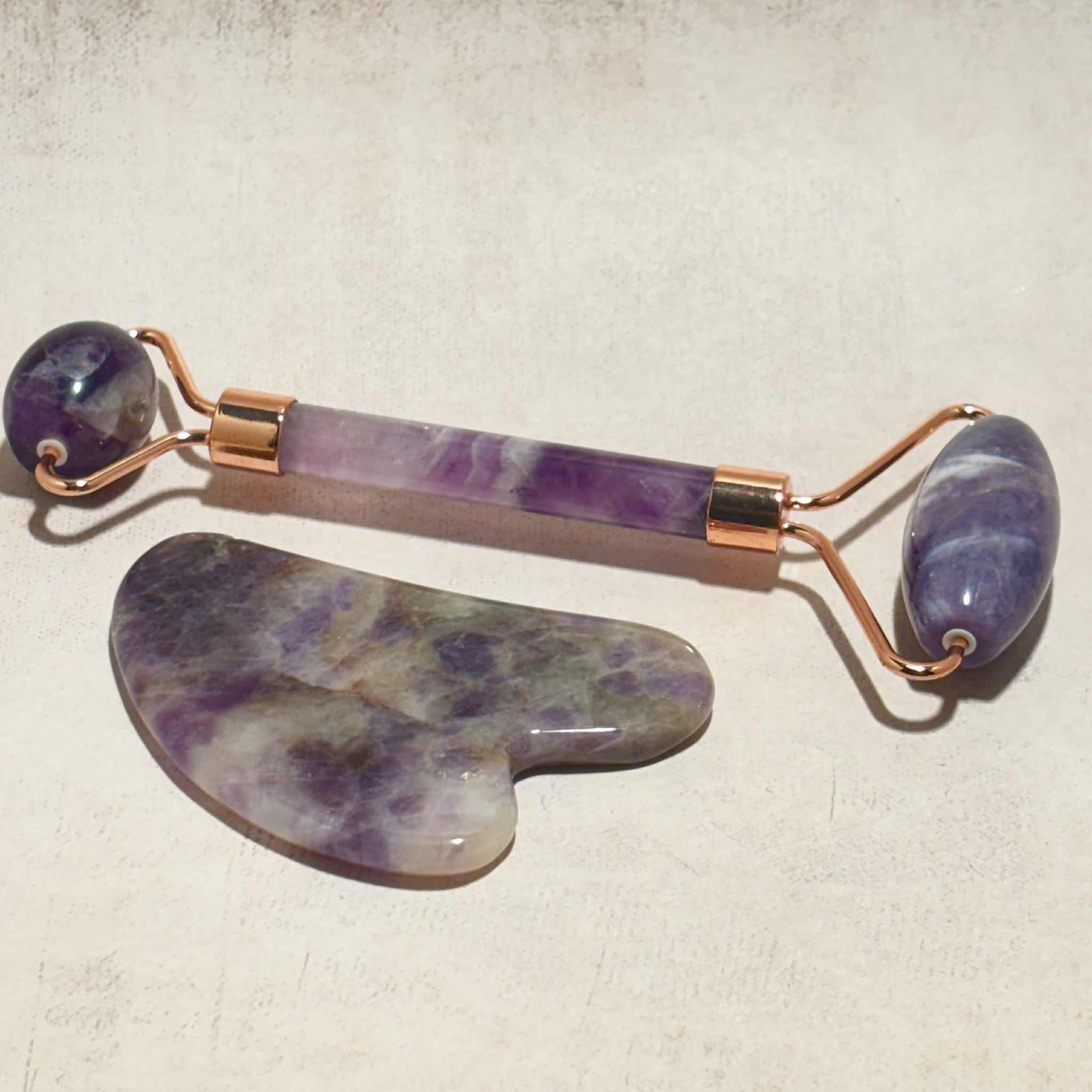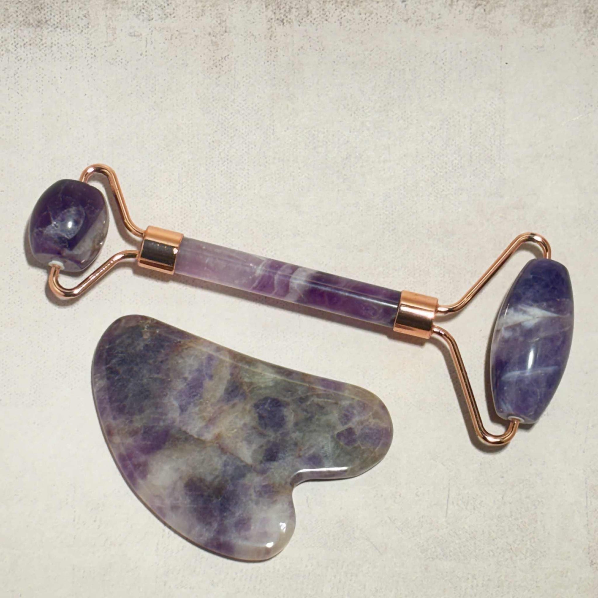 Découvrez notre coffret bien-être complet associant deux outils de beauté essentiels en améthyste véritable. Le gua sha et le roller travaillent en synergie pour stimuler la circulation cutanée, réduire les tensions faciales et favoriser l'absorption des sérums.